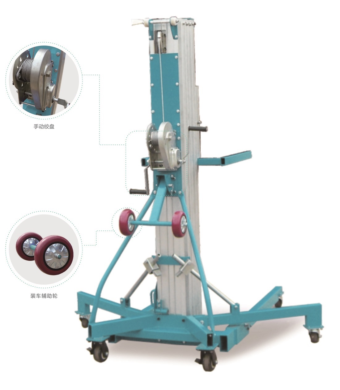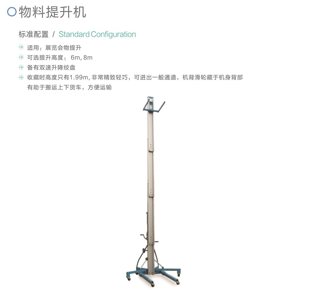 備有雙速升降絞盤收藏時高度只有1.99m, 非常精致輕巧,可進出一般通道,機背滑輪藏于機身背部有助于搬運上下貨車,方便運輸