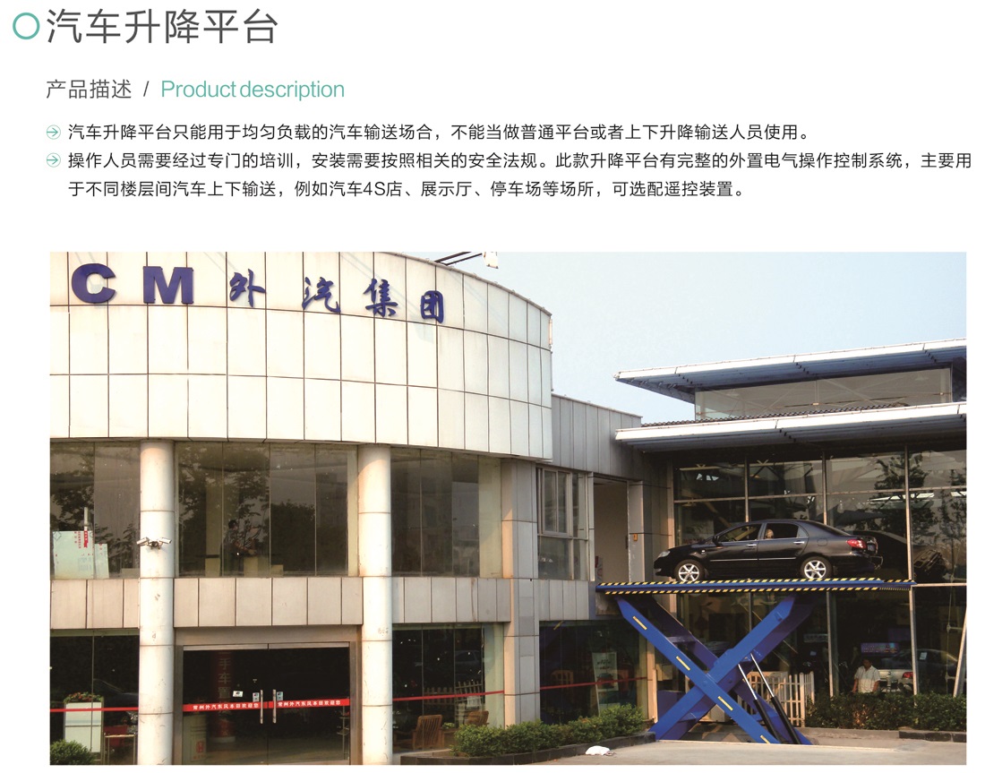 汽車(chē)升降平臺(tái)只能用于均勻負(fù)載的汽車(chē)輸送場(chǎng)合,不能當(dāng)做普通平臺(tái)或者上下升降輸送人員使用。
